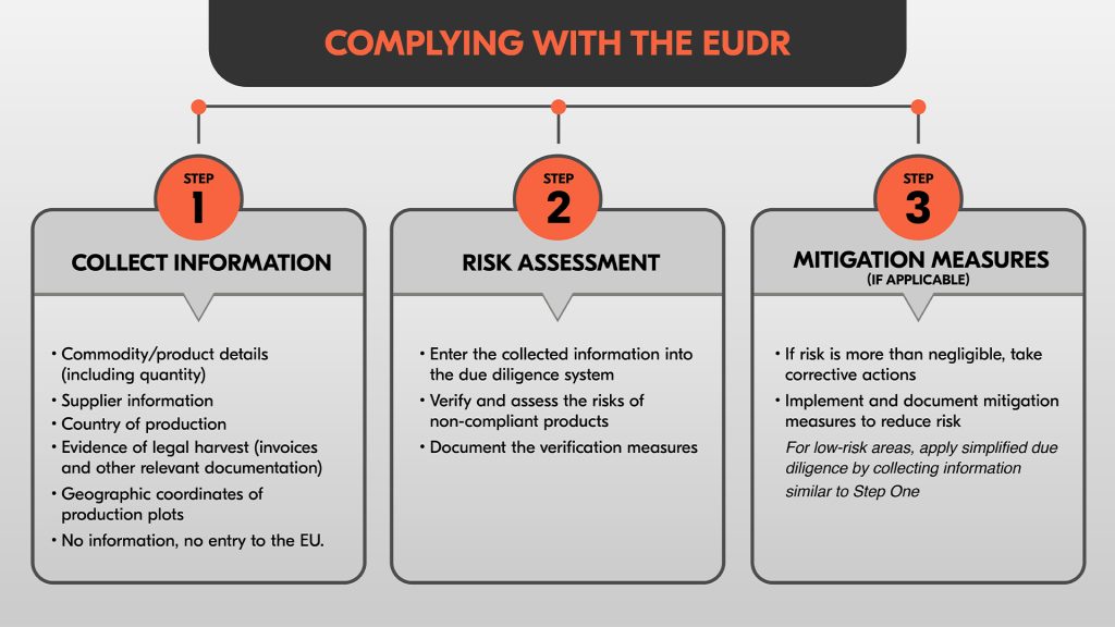 To comply with the regulations, traders and operators must have due diligence systems in place that comprise these elements: information requirements, risk assessment and risk mitigation measures. The due diligence measures, designed to provide access to information about the sources and suppliers of commodities and products being imported, are complemented by reporting obligations.